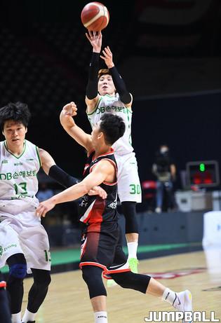 [점프볼=부산/문복주 기자] 13일 부산 사직실내체육관에서 열린 2020-2021 현대모비스 프로농구 부산 kt와 원주 DB의 경기, DB 허 웅이 저돌적으로 골밑을 파고들어 레이업을 시도하고 있다.