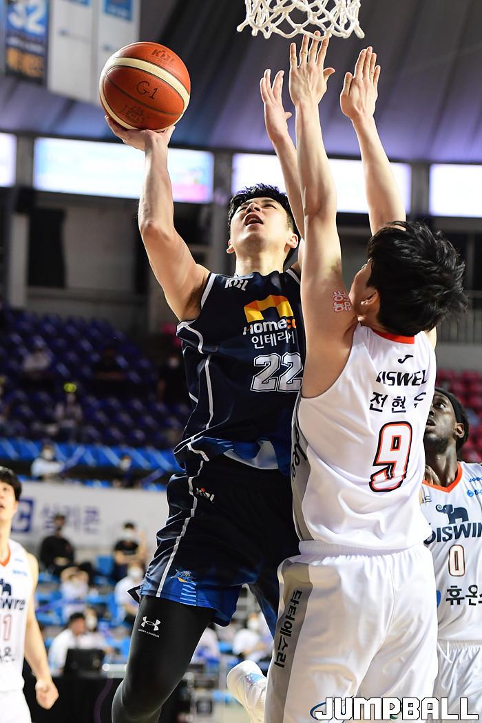 [점프볼=전주/박상혁 기자] 23일 전주실내체육관에서 열린 2020-2021 현대모비스 프로농구 전주 KCC와 인천 전자랜드의 경기, KCC 김상규가 골밑에서 슛을 시도하고 있다.