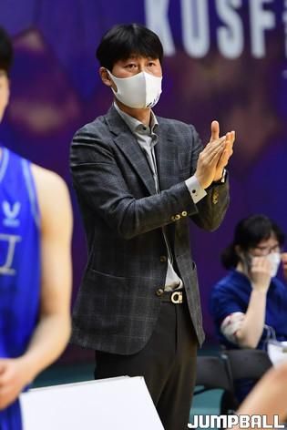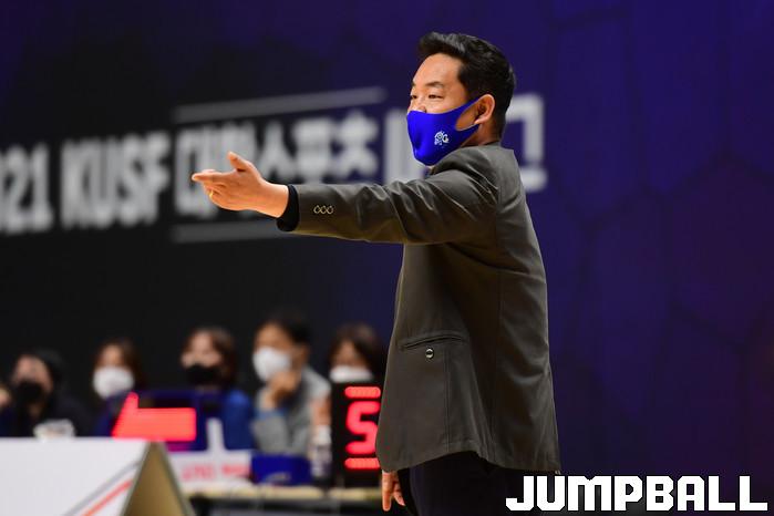 [점프볼=수원/박상혁 기자] 27일 서수원칠보체육관에서 열린 2021 KUSF 대학농구 U리그 중앙대와 한양대의 경기, 한양대 정재훈 감독이 선수들에게 지시를 내리고 있다.