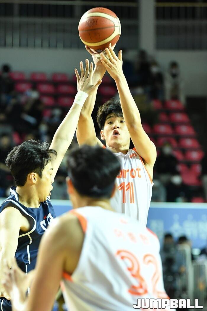 25일 전주실내체육관에서 열린 2022-2023 SKT 에이닷 프로농구 전주 KCC와 고양 캐롯의 경기, 캐롯 조한진이 슛을 던지고 있다. [점프볼=전주/유용우 기자]