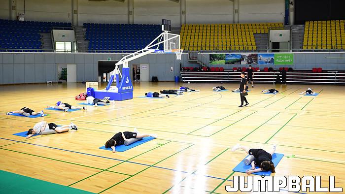 [점프볼=태백/박상혁 기자] 8일 강원도 태백시 고원체육관에서 여자프로농구 삼성생명 선수단이 비시즌 전지훈련을 가졌다. 삼성생명 선수단이 폼롤러를 이용해 스트레칭을 하고 있다.