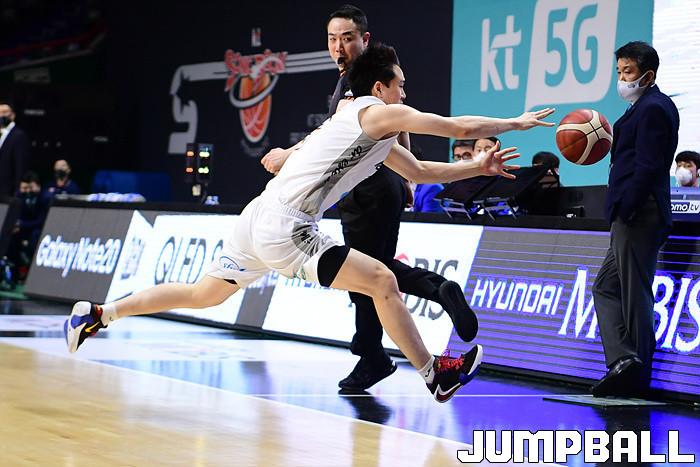 [점프볼=부산/박상혁 기자] 27일 부산사직체육관에서 열린 2020-2021 현대모비스 프로농구 부산 KT와 인천 전자랜드의 경기, 전자랜드 임준수가 사이드 라인 밖으로 나가는 공을 살려내기 위해 몸을 날리고 있다.