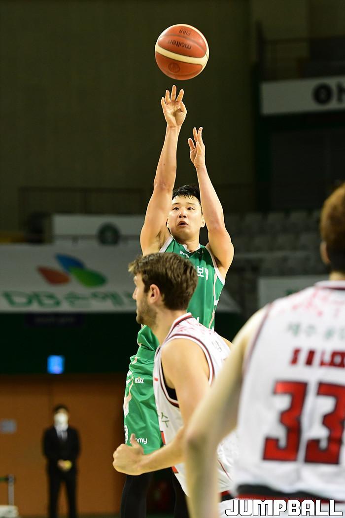[점프볼=원주/박상혁 기자] 23일 원주종합체육관에서 열린 2020-2021 현대모비스 프로농구 원주 DB와 고양 오리온의 경기, DB 허웅이 3점슛을 시도하고 있다.