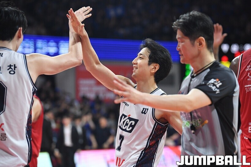 [점프볼=안양/유용우 기자] 24일 안양 정관장 아레나에서 열린 2025~2026 LG전자 프로농구 4강 플레이오프 1차전 안양 정관장과 부산 KCC의 경기, KCC 허훈이 승기를 잡고 하이파이브를 하고 있다.