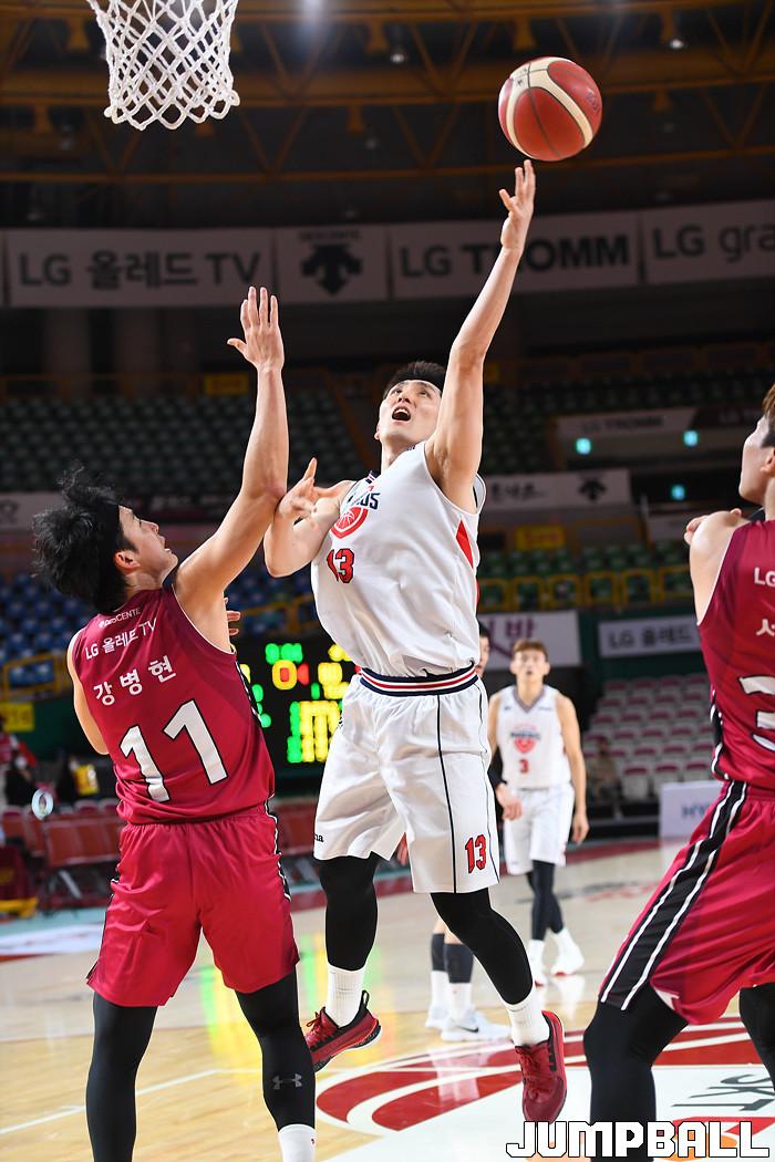 [점프볼=창원/문복주 기자] 14일 창원 실내체육관에서 열린 2020-2021 현대모비스 프로농구 창원 LG와 울산 현대모비스의 경기, 현대모비스 기승호가 골밑 중앙을 파고들어 레이업을 시도하고 있다.
