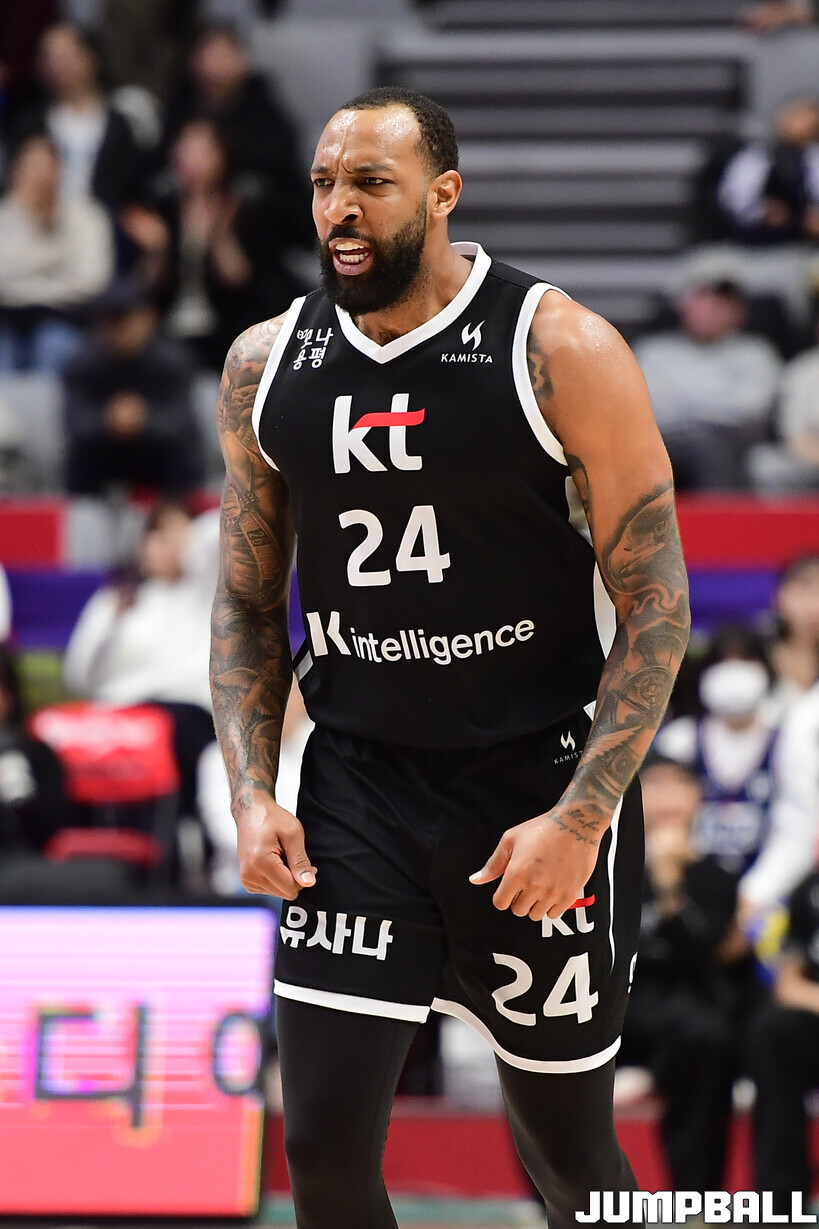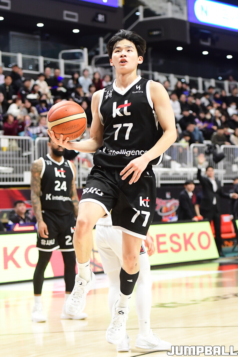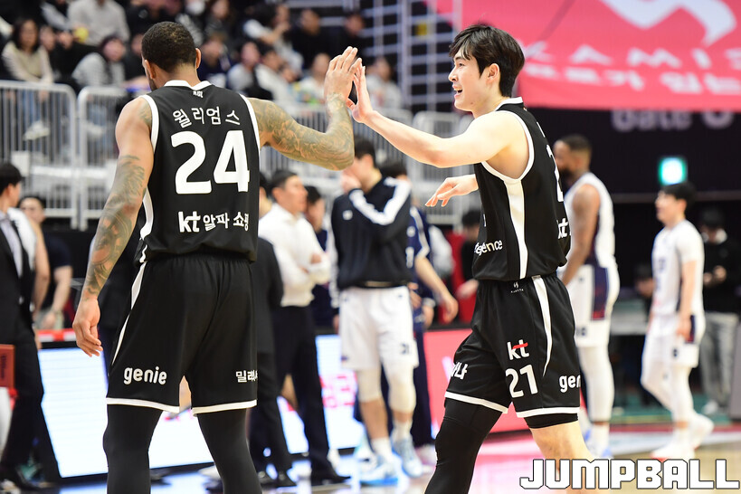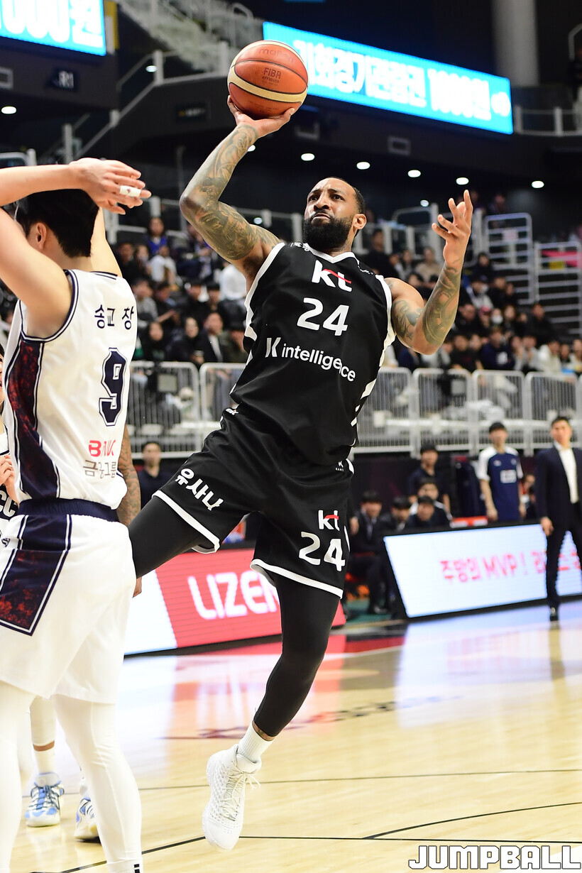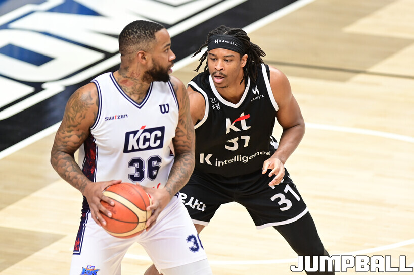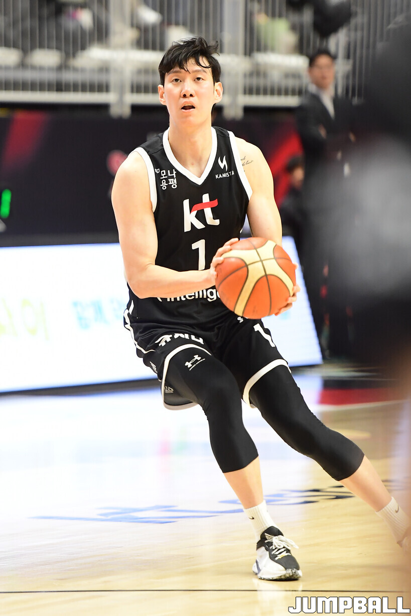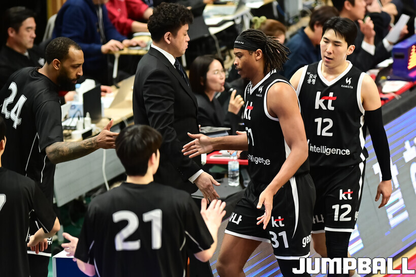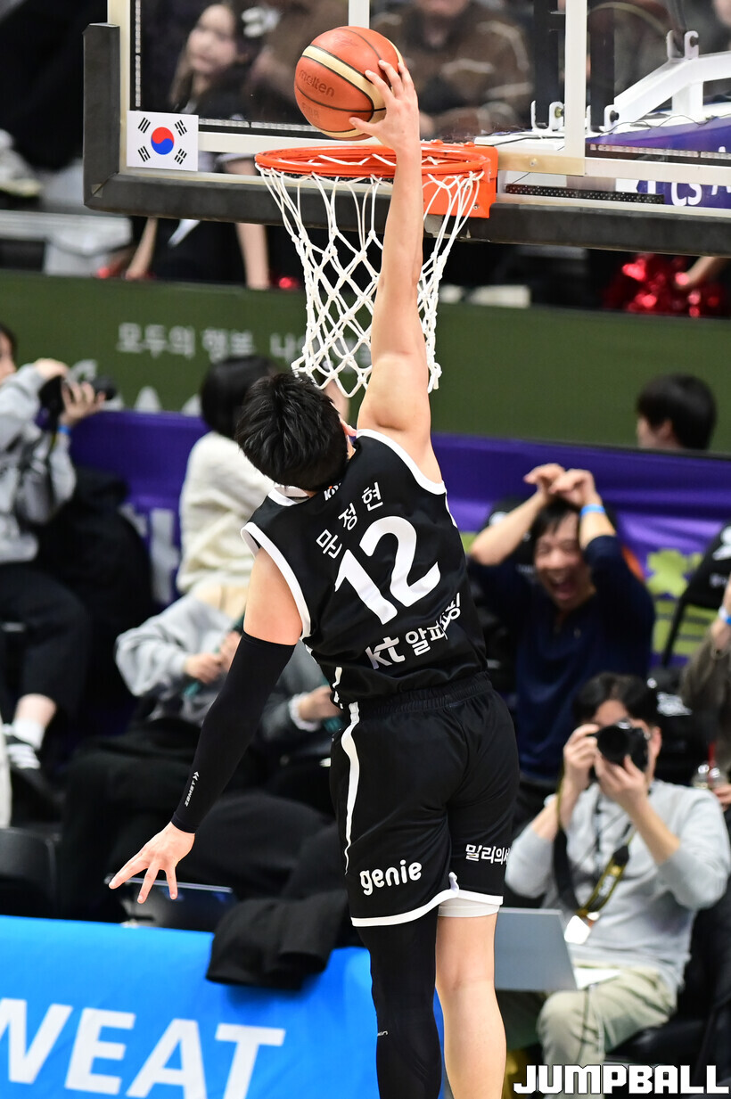 [점프볼=수원/박상혁 기자] 14일 수원 KT 소닉붐 아레나에서 열린 2025-2026 LG전자 프로농구 수원 KT와 부산 KCC의 경기, KT가 데릭 윌리엄스의 32점과 강성욱의 20점 활약으로 숀 롱이 33득점을 기록한 KCC에 107-95로 승리했다.