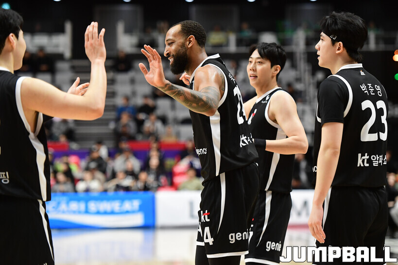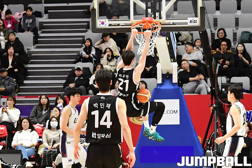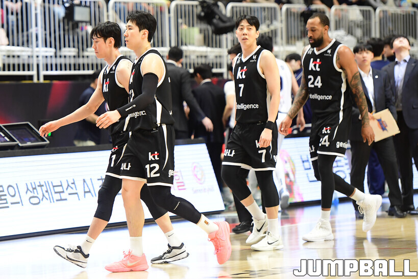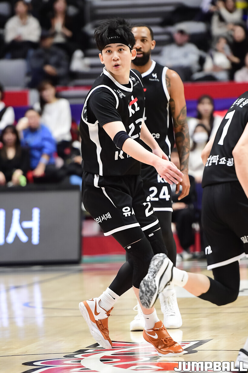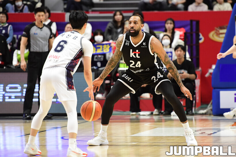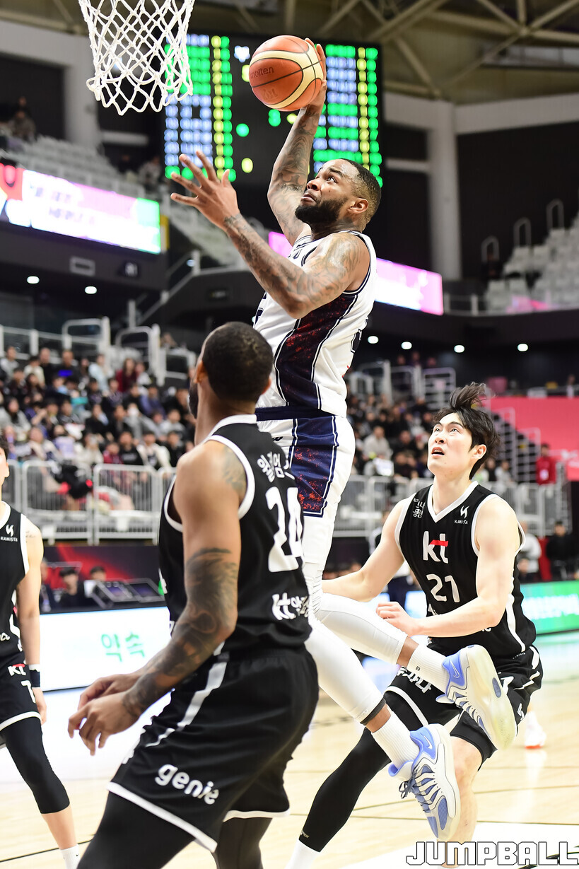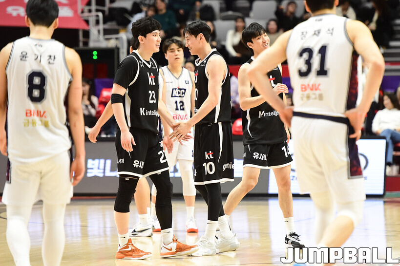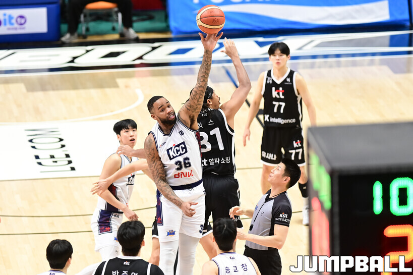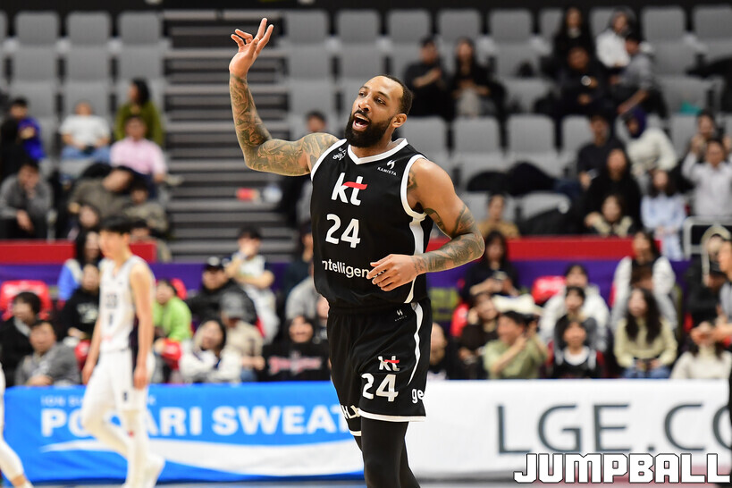 [점프볼=수원/박상혁 기자] 14일 수원 KT 소닉붐 아레나에서 열린 2025-2026 LG전자 프로농구 수원 KT와 부산 KCC의 경기, KT가 데릭 윌리엄스의 32점과 강성욱의 20점 활약으로 숀 롱이 33득점을 기록한 KCC에 107-95로 승리했다.