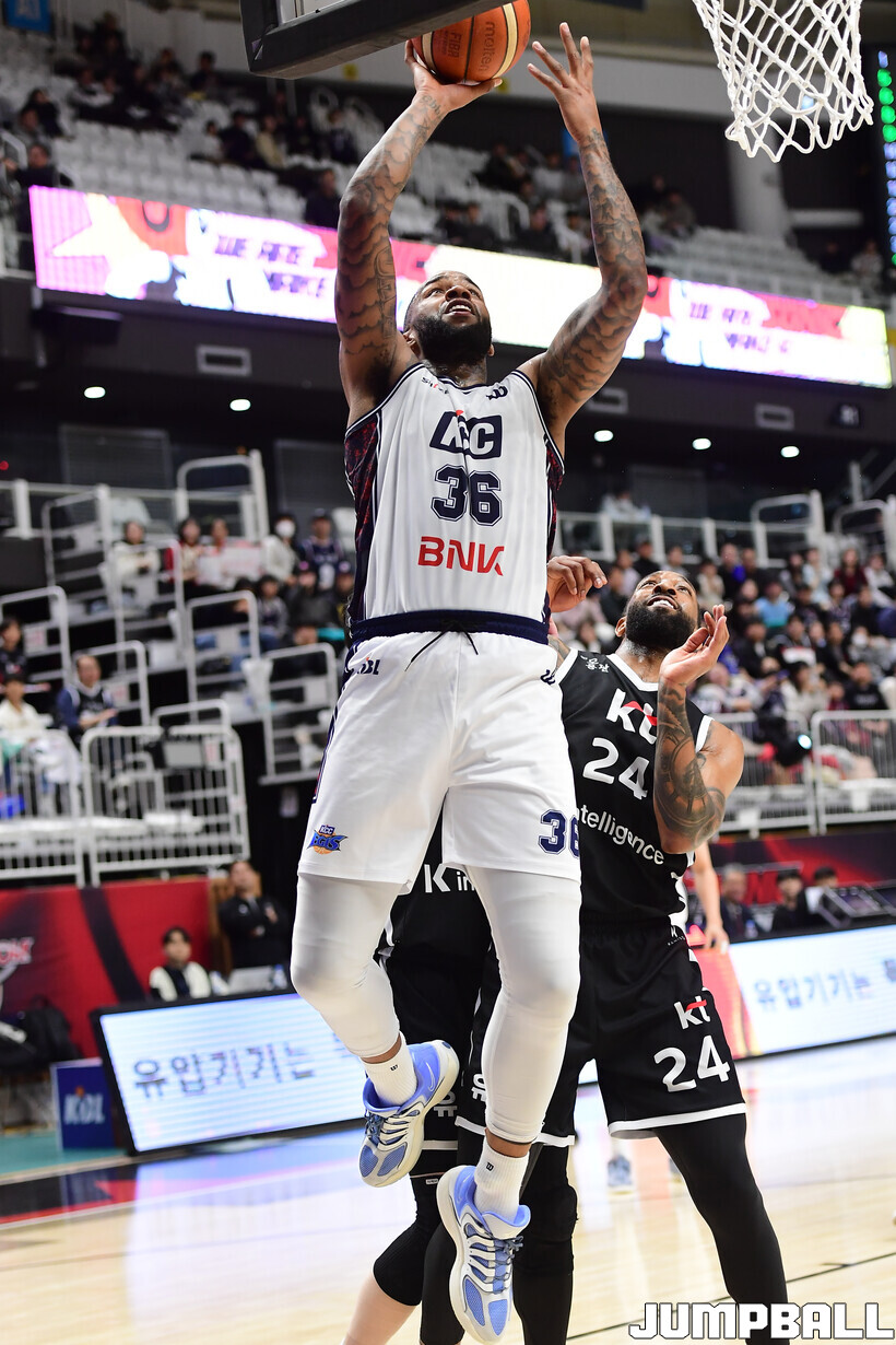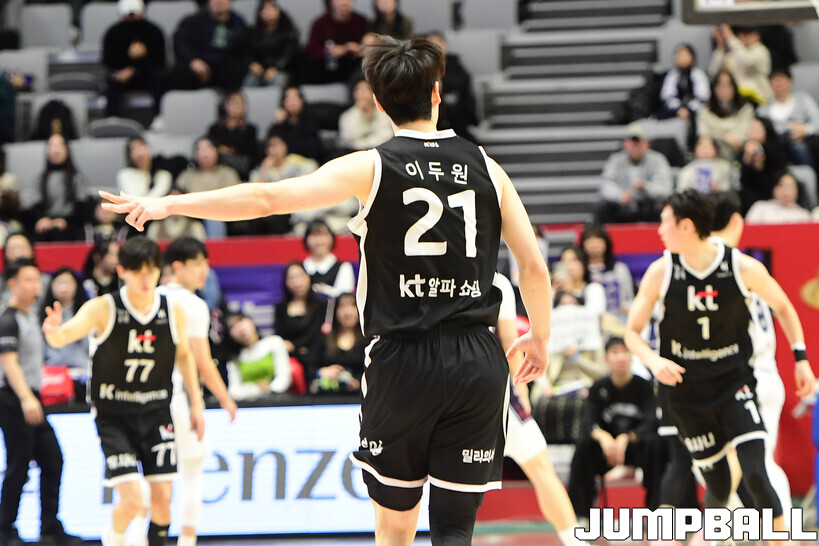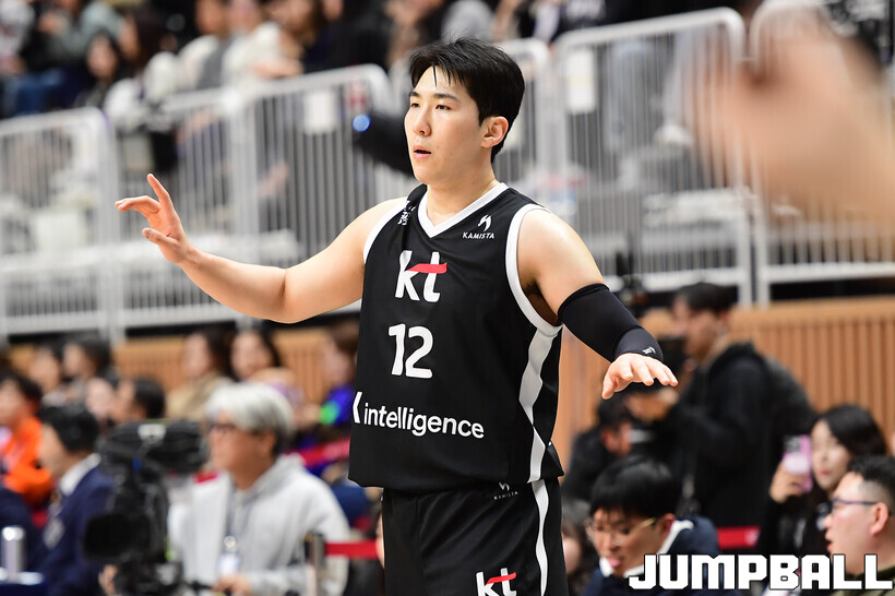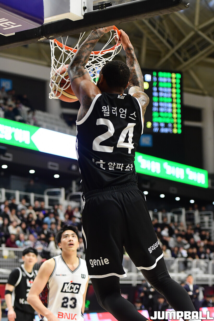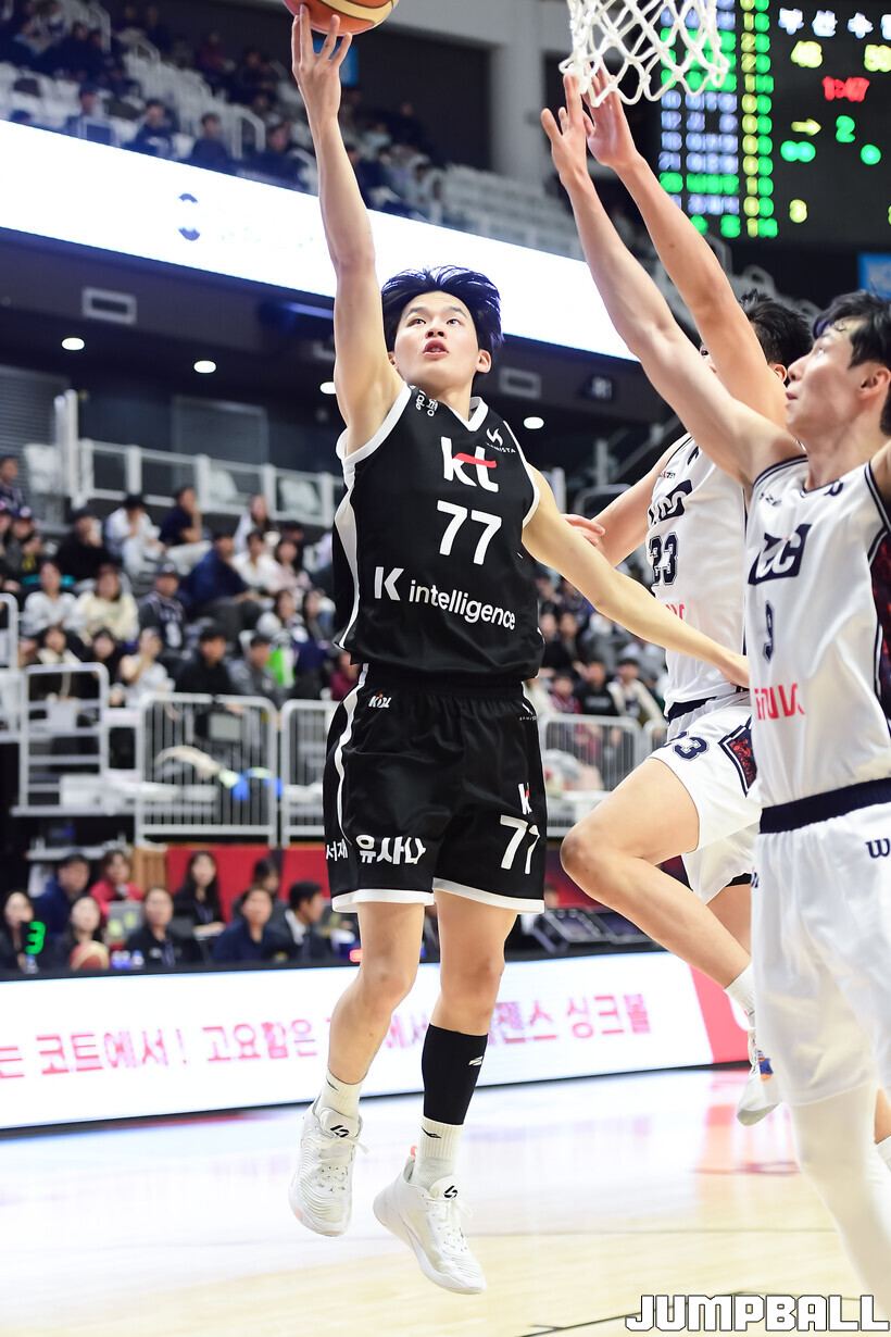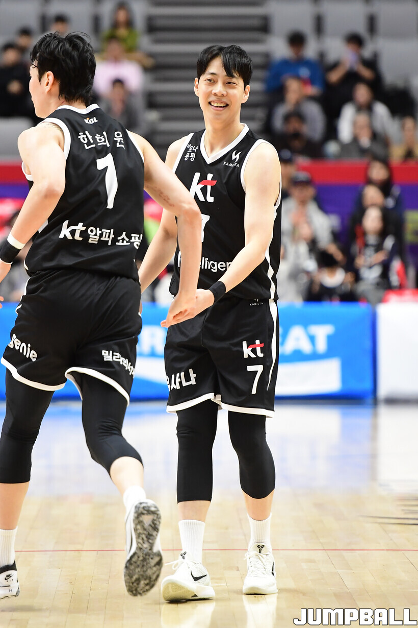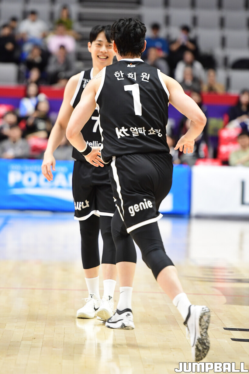 [점프볼=수원/박상혁 기자] 14일 수원 KT 소닉붐 아레나에서 열린 2025-2026 LG전자 프로농구 수원 KT와 부산 KCC의 경기, KT가 데릭 윌리엄스의 32점과 강성욱의 20점 활약으로 숀 롱이 33득점을 기록한 KCC에 107-95로 승리했다.