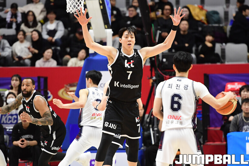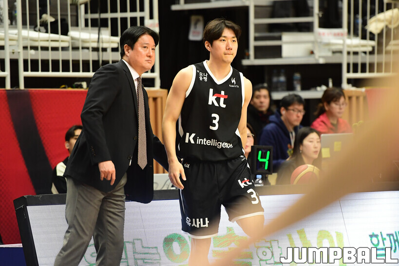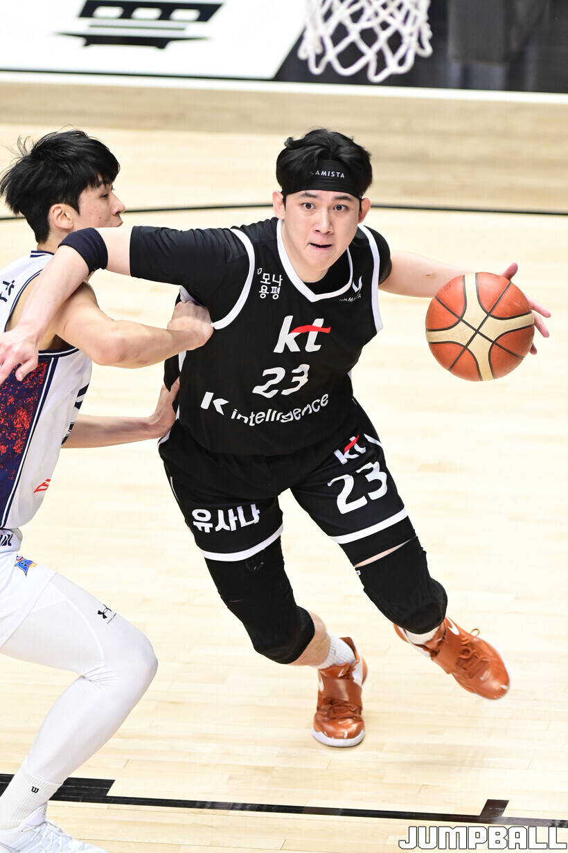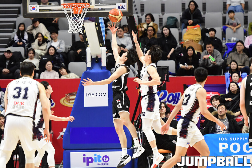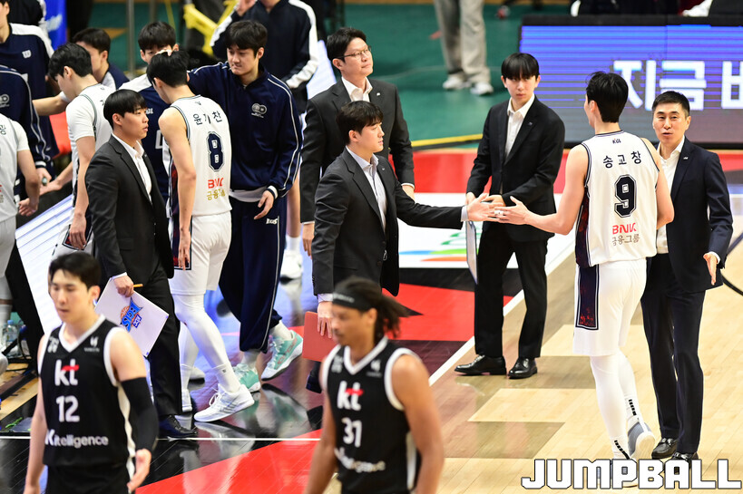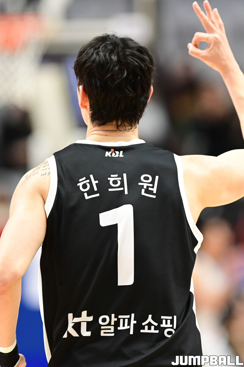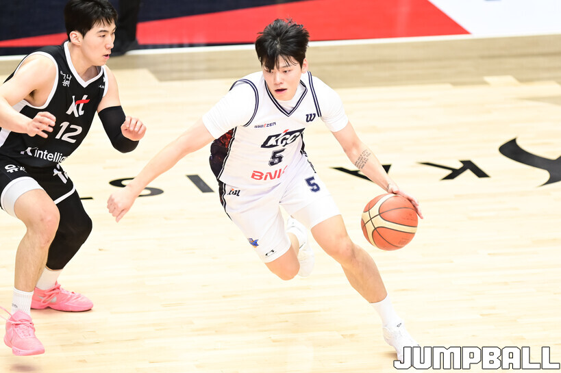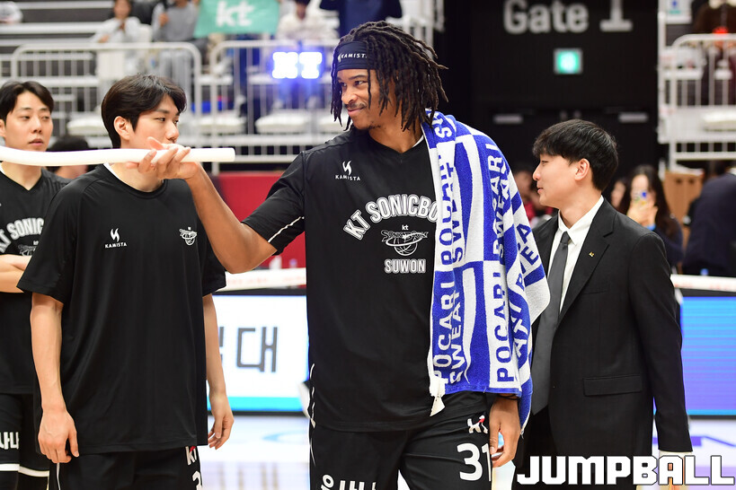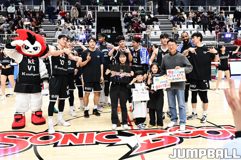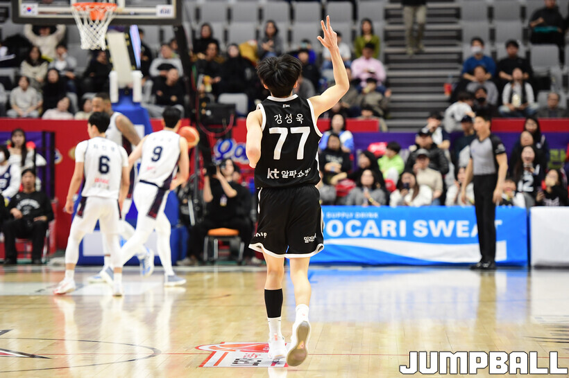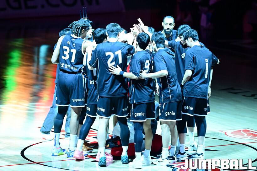 [점프볼=수원/박상혁 기자] 14일 수원 KT 소닉붐 아레나에서 열린 2025-2026 LG전자 프로농구 수원 KT와 부산 KCC의 경기, KT가 데릭 윌리엄스의 32점과 강성욱의 20점 활약으로 숀 롱이 33득점을 기록한 KCC에 107-95로 승리했다.