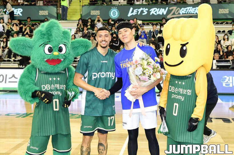 [점프볼=원주/박상혁 기자] 20일 원주 DB 프로미 아레나에서 열린 2025-2026 LG전자 프로농구 원주 DB와 서울 삼성의 경기, 지난 시즌까지 DB에서 활약했던 삼성 이관희가 원주 방문 기념 꽃다발 전달식을 가진 후 알바노랑 기념 사진 촬영을 하고 있다.
