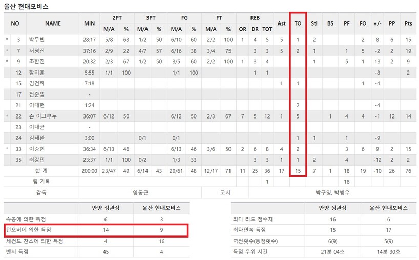 현대모비스는 이그부누가 오펜스 파울을 범하는 등 가장 많은 5개의 실책을 기록했고, 총 8명이 실책을 범했다. 총 15개의 실책을 기록했는데, 정관장전 실책은 오히려 16.3개에서 16개로 소폭 낮아졌다. 그야말로 ‘웃픈 현실’이었다. 실책에 의한 득점 역시 9-14 열세.