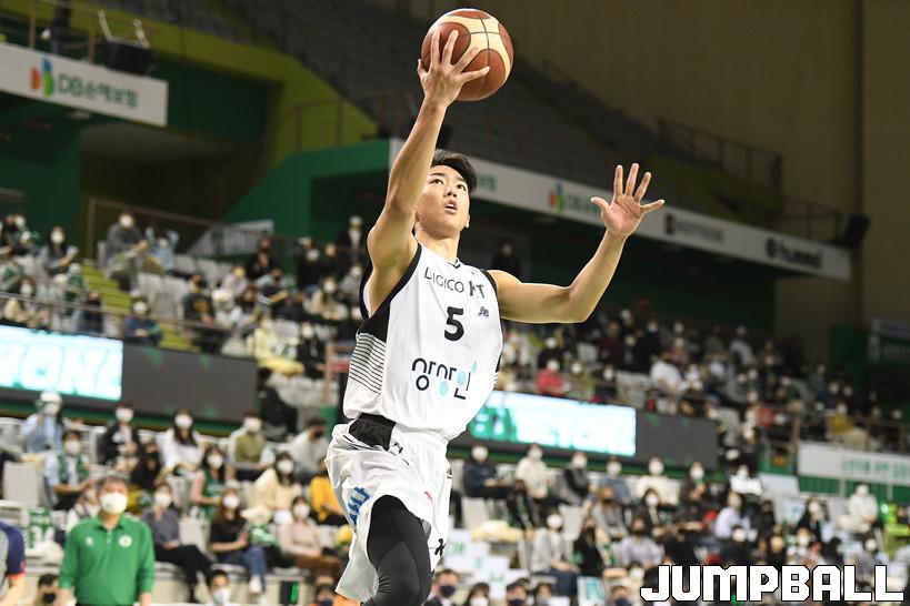 10일 원주종합체육관에서 열린 2021-2022 KGC인삼공사 정관장 프로농구 원주 DB와 수원 KT의 경기, KT 박지원이 레이업슛을 시도하고 있다.