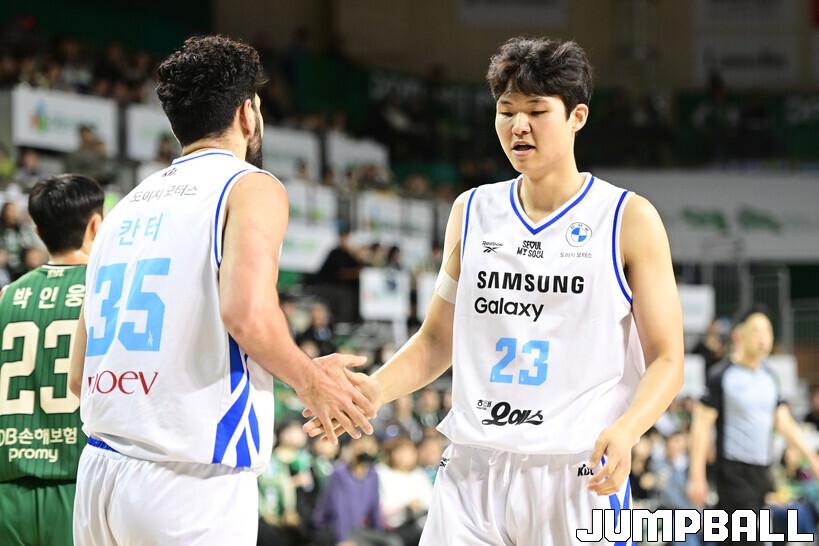 [점프볼=원주/박상혁 기자] 20일 원주 DB 프로미 아레나에서 열린 2025-2026 LG전자 프로농구 원주 DB와 서울 삼성의 경기, 삼성 이규태가 칸터와 하이파이브를 하고 있다.