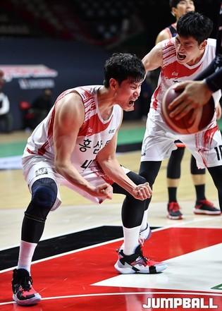 [점프볼=부산/유용우 기자] 22일 부산 사직실내체육관에서 열린 '2020-2021 현대모비스 프로농구'  부산 kt와 안양 KGC인삼공사의 경기, KGC 오세근이 2차 연장전 끝에 93-89로 승리하며 환호하고 있다.
