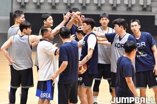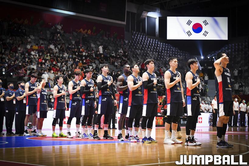 12일 인도네시아 자카르타 이스토라 세네얀에서 열린 FIBA 아시아컵 B조 대한민국과 중국의 경기. 애국가가 울리자 대표팀 선수들이 국민의례를 하고 있다.