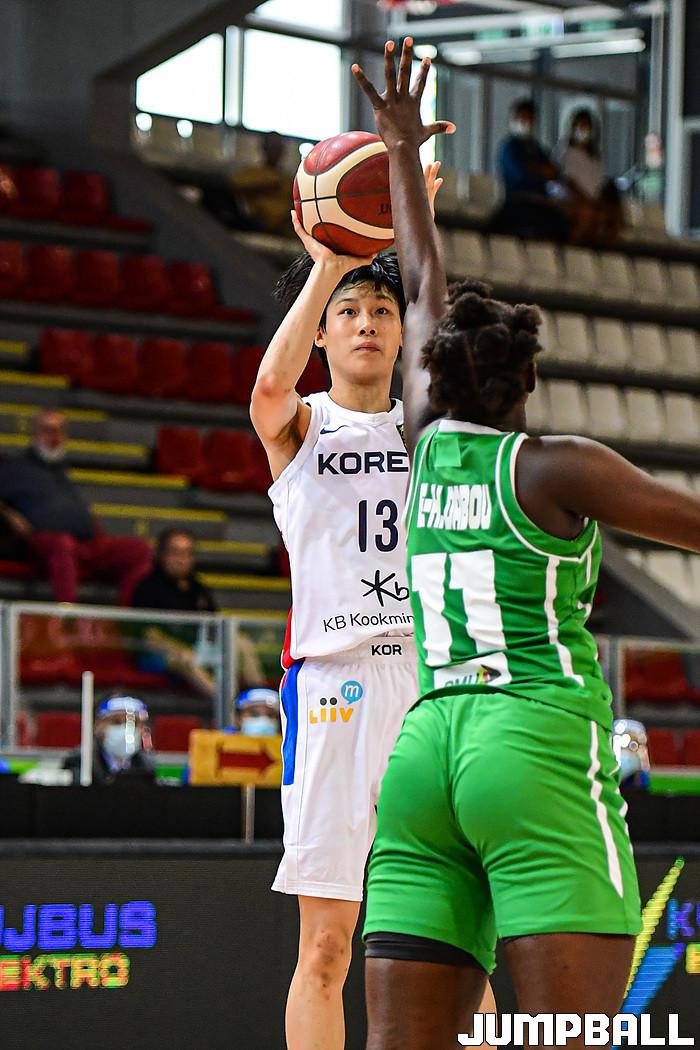 11일 헝가리 데브레첸 호도스 임레 스포츠홀에서 열린 '2021 FIBA U19 여자농구월드컵' 한국과 말리의 16강전 경기, 이해란이 수비를 앞에두고 슛을 시도하고 있다.