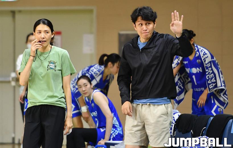 우리은행은 14일 아산이순신체육관에서 열린 천안쌍용고와 오프시즌 첫 연습경기에서 위성우 감독이 경기를 마무리하고 손을 들어 상대 선수들에게 격려를 하고 있다.