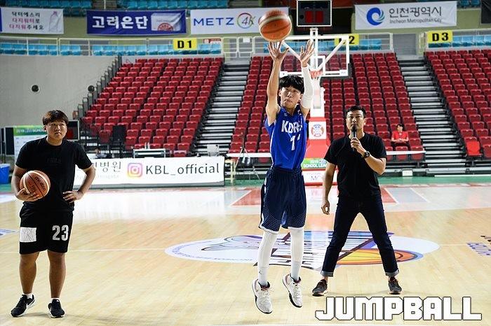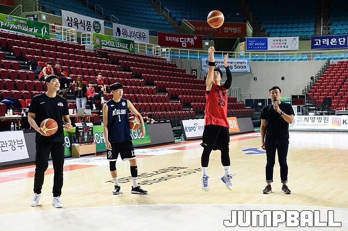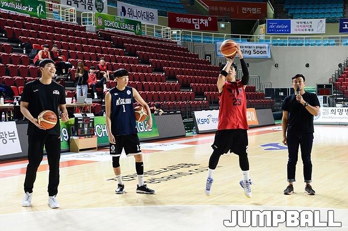 [점프볼=인천/유용우 기자] 9일 인천 삼산체육관에서 열린 2019 KBL 스쿨리그 지역 예선, 전자랜드 이대헌 선수와 참가 학생들이 3점슛 이벤트를 하고 있다.