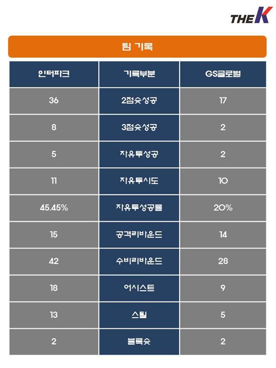 GS글로벌은 인터파크 속공에 고전하면서도 정윤철, 김충현, 이승곤이 상대 수비 빈틈을 집요하게 파고들어 반격에 나섰다. 박우현, 송세민이 이승곤과 함께 리바운드 다툼에 전념하여 동료들 뒤를 받쳤다. 하지만, 끊임없이 뛰고 또 뛰는 인터파크 속공을 저지하는 데 애를 먹은 탓에 수비조직력이 급격하게 흔들렸다.