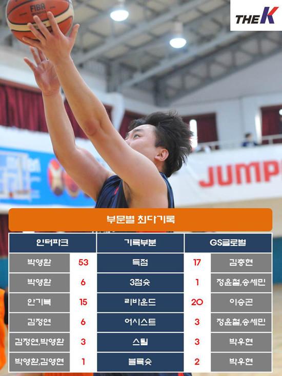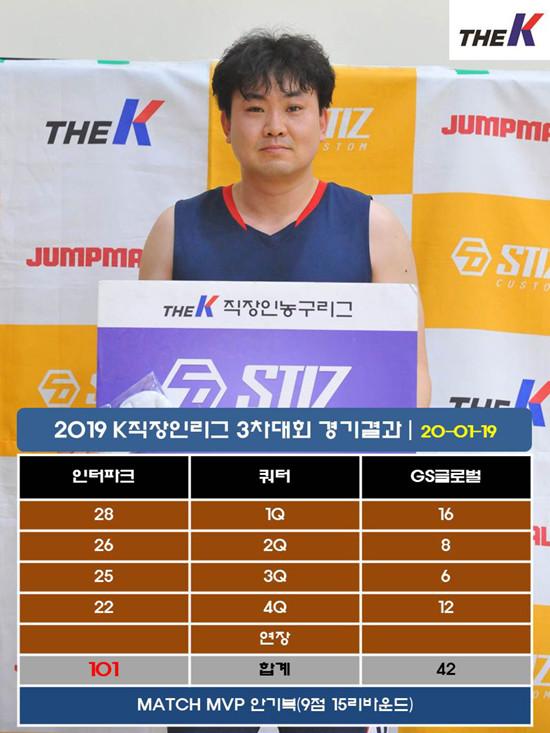 인터파크는 19일 서울 관악고등학교 체육관에서 열린 STIZ배 2019 The K직장인농구리그(www.kbasket.kr) 3차대회 디비전 3 B조 예선전에서 53점을 몰아친 박영환(5리바운드 3어시스트 3스틸, 3점슛 6개)을 필두로 김영현(22점 10리바운드 3어시스트, 3점슛 2개), 안기복(9점 15리바운드), 김정연(8점 6리바운드 6어시스트) 등 고른 활약에 힘입어 GS글로벌을 101-42로 꺾고 디비전 3 B조 1위를 확정지었다.
