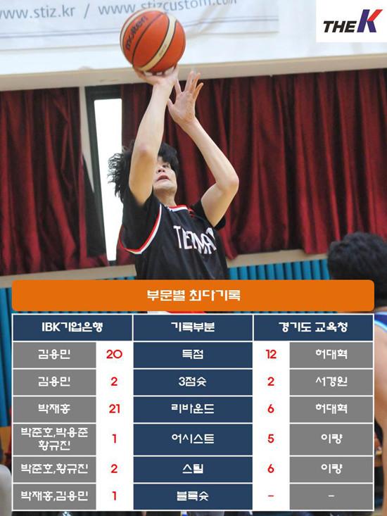 IBK기업은행도 김용민, 박재홍 트윈타워를 동시에 투입하여 경기도 교육청 수비를 공략했다. 신체조건 우위를 바탕으로 리바운드를 걷어냈고, 파울을 얻어내기를 반복했다. 박재홍은 골밑을 저돌적으로 파고들어 3쿼터에만 7점을 몰아쳤다. 정종윤이 3점슛을 성공시켜 상대 수비 시선을 넓혔고, 김의수가 돌파능력을 발휘하여 상대 수비를 흔들었다. 최성일, 황규진, 김기운은 궂은일을 도맡으며 팀원들 활약을 도왔다.