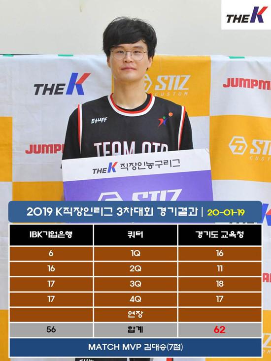 한편, 이 경기 STIZ(www.stiz.kr) 핫 플레이어에는 알토란같은 7점을 올려 팀 승리에 보탬이 된 경기도 교육청 김대승이 선정되었다. 그는 “IBK기업은행이 터프하게 하는 팀이다 보니 효율적인 움직임을 통하여 이겨내려고 했는데, 생각보다 정말 터프한 탓에 리바운드 다툼에서 크게 밀렸다. 때문에 오펜스 리바운드에 이은 풋백 득점을 많이 허용하여 어려운 경기를 했다”며 “앞선에서 압박을 가하여 패스 흐름을 뻑뻑하게 했고, 박스아웃에 온 신경을 기울였다. 줄 것은 주되 막을 수 있는 부분에 집중하여 팽팽한 흐름을 만들었고, 승리로 연결할 수 있었다. 앞으로 경기에서도 이 부분을 보완하여 준비할 수 있도록 하겠다. 이날 승리 일등공신은 좋은 수비에서 나오지 않았나 싶다”고 안도의 한숨을 내쉬었다.