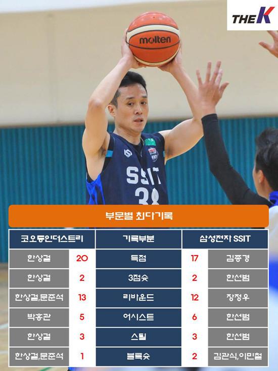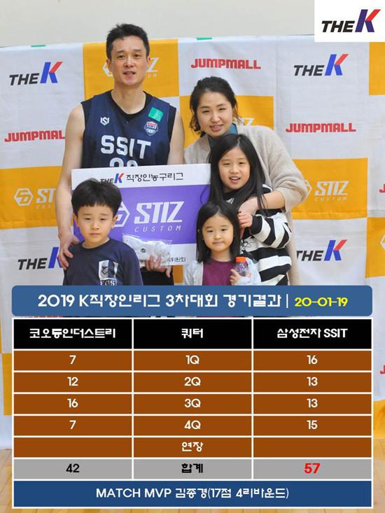 삼성전자 SSIT는 19일 서울 관악고등학교 체육관에서 열린 STIZ배 2019 The K직장인농구리그(www.kbasket.kr) 3차대회 디비전 2 B조 예선에서 김종경(17점 4리바운드), 한선범(14점 6어시스트 4리바운드 3스틸, 3+1점슛 2개) 노장 듀오와 막내 임성혁(10점 8리바운드) 활약이 어우러지며 코오롱인더스트리를 57-42로 잡고 준결승 진출을 확정지었다.