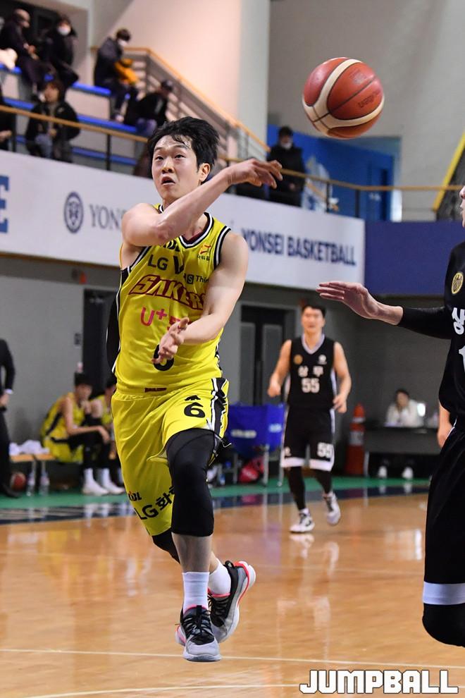 [점프볼=신촌/홍기웅 기자] 3일 연세대학교 신촌캠퍼스 체육관에서 열린 '2019-2020 KBL D리그' 창원 LG와 국군 상무의 경기. LG 한상혁이 노룩 패스로 동료에게 패스를 건네고 있다.