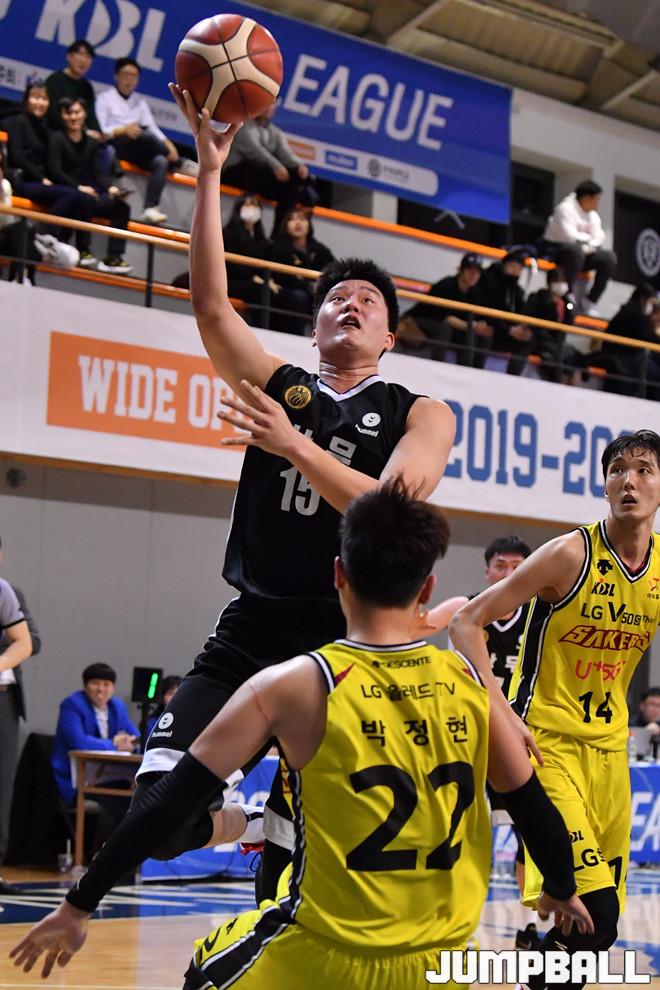 [점프볼=신촌/홍기웅 기자] 3일 연세대학교 신촌캠퍼스 체육관에서 열린 '2019-2020 KBL D리그' 창원 LG와 국군 상무의 경기. 상무 박세진이 골밑슛을 던지고 있다.