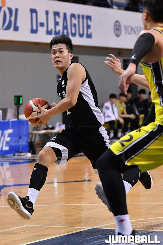 [점프볼=신촌/홍기웅 기자] 3일 연세대학교 신촌캠퍼스 체육관에서 열린 '2019-2020 KBL D리그' 창원 LG와 국군 상무의 경기. 상무 정해원이 스텝을 밟으며 골밑을 향해 들어가고 있다.
