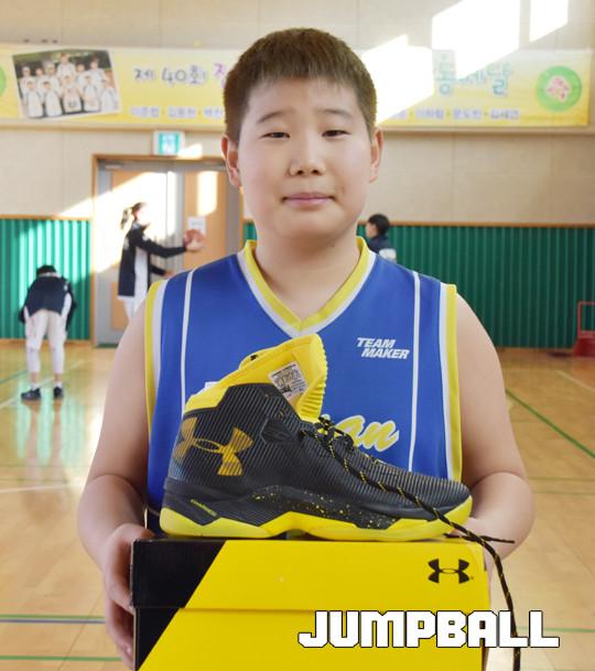 [점프볼=수원/노경용 기자] 좋은 나눔 ‘GOOD TOGETHER’ 농구대회에서 수원 매산초 이시영 선수에게 농구화를 증정했다.