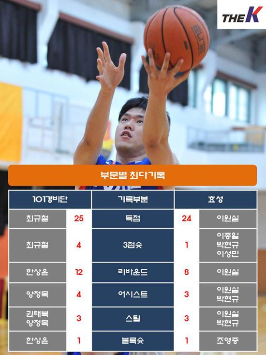101경비단은 이날 어린 선수들을 주축으로 패기 있는 모습을 보여주었다. 초반에 마음먹은 대로 경기라 풀리면서 자신감이 생겼다. 최규철 자신도 전반에만 3점슛 3개 포함, 17점을 몰아치며 절정에 달하는 슛 감각을 뽐냈다. 이에 “중간에 형들이 잡아줘야 하는 부분이 있어야 한다고 생각한다. 오늘 경기에서는 (권)태복이형이 나서서 열심히 리드했는데, 이런 부분에서 우리들을 잘 이끌어줄 것이라 믿는다”며 “경기 전 슛을 던졌을 때 잘 들어가는 걸 보니 감이 좋았다. 손가락을 다쳐서 3주 쉬었는데 오늘 경기에서 운 좋게 잘 들어가서 기분이 좋다”고 말했다.