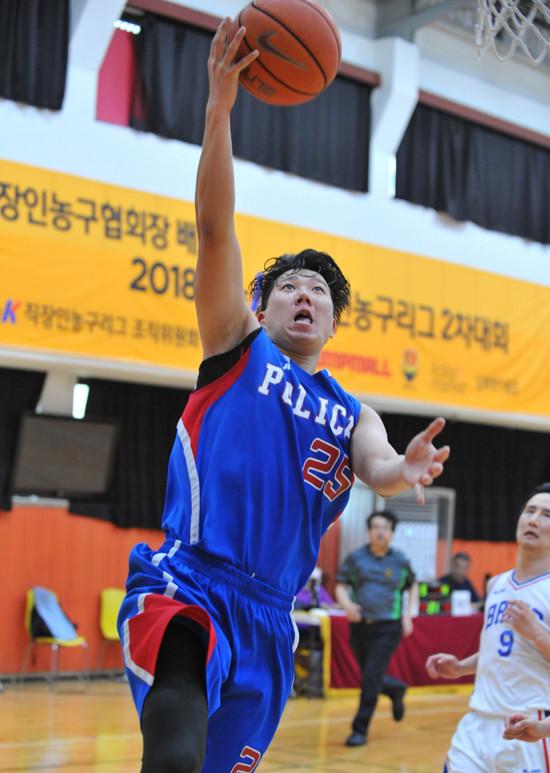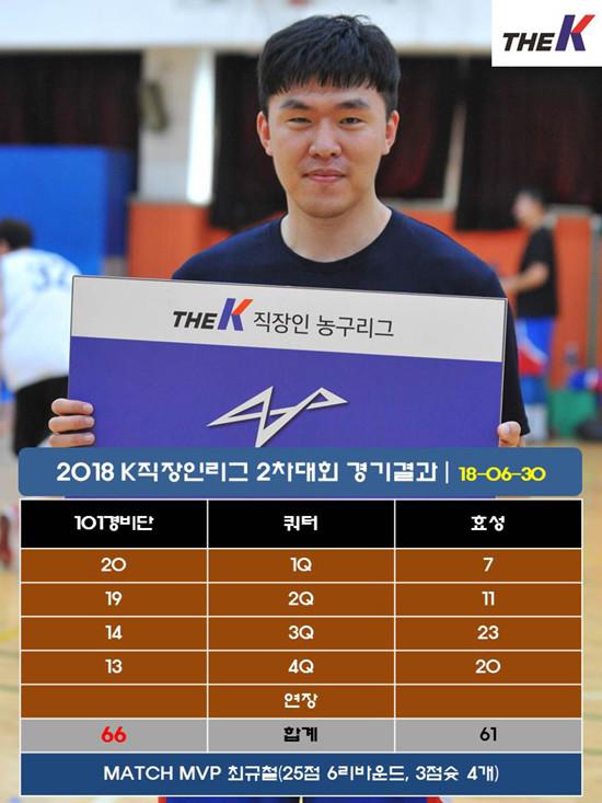 101경비단은 30일 서울 관악고등학교 체육관에서 열린 대한직장인농구협회장배 2017 The K직장인농구리그(www.kbasket.kr) 2차대회 디비전 1 B조 예선전에서 49점을 합작한 최규철(25점 6리바운드, 3점슛 4개), 양정목(24점 10리바운드 4어시스트 3스틸)과 리바운드 13개를 걷어내며 골밑을 든든하게 지킨 한상윤(5점) 활약에 힘입어 효성 추격을 66-61로 따돌리고 첫 경기를 승리로 장식했다.