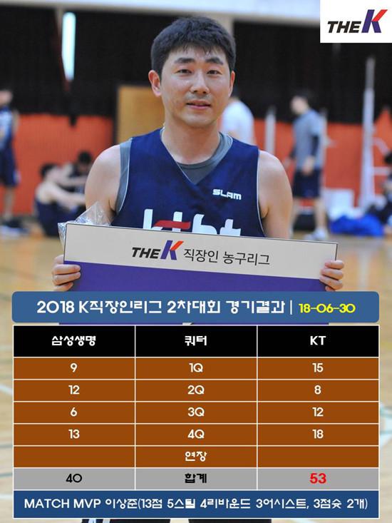 KT는 30일 서울 관악고등학교 체육관에서 열린 대한직장인농구협회장배 2018 The K직장인농구리그(www.kbasket.kr) 2차대회 디비전 2 A조 예선전에서 주전 포인트가드 이상준이 3점슛 2개 포함, 13점 5스틸 4리바운드 3어시스트를 올리며 팀을 이끌었고 조성민(9점 4리바운드), 최우석(9점)이 4쿼터 맹활약에 힘입어 삼성생명을 53-40으로 꺾고 첫 승리를 신고했다.