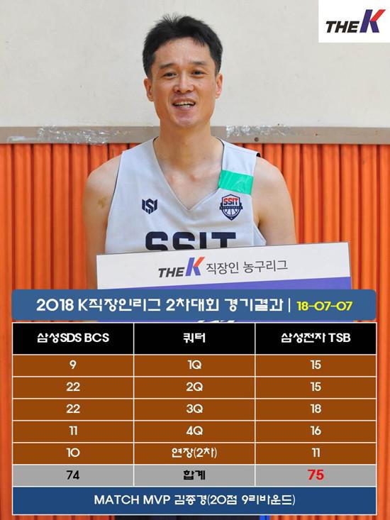 삼성전자 TSB는 7일 서울 관악고등학교 체육관에서 열린 대한직장인농구협회장배 2017 The K직장인농구리그(www.kbasket.kr) 2차대회 디비전 2 B조 예선전에서 20점 9리바운드를 기록하며 맹활약한 ‘뉴페이스’ 김종경과 28점 14리바운드를 합작한 김관식(18점 10리바운드 6스틸), 정진혁(10점 4리바운드) 활약에 힘입어 삼성SDS BCS를 2차 연장까지 가는 접전 끝에 75-74로 꺾고 첫 경기를 승리로 장식했다.