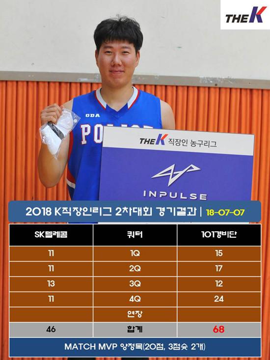 101경비단은 7일 서울 관악고등학교 체육관에서 열린 대한직장인농구협회장배 2018 The K직장인농구리그(www.kbasket.kr) 2차대회 디비전 1 B조 예선전에서 3점슛 2개 포함, 20점을 올린 양정목을 필두로 이정규(15점), 조충식(5점 10리바운드) 등 출전선수 9명 모두 득점을 올리는 고른 활약에 힘입어 SK텔레콤을 68-46으로 꺾고 2연승을 내달렸다,