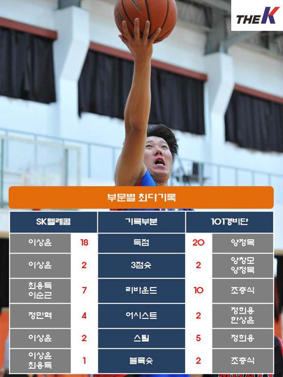 SK텔레콤은 2차대회들어 처음 모습을 보인 이상윤이 3점슛 2개 포함, 18점 3리바운드로 팀을 이끌었다. 박지훈은 절정에 달하는 돌파능력을 과시하며 11점 3리바운드를 올리며 뒤를 받쳤다. 하지만, 대들도 이순근이 101경비단 조충식 수비에 고전, 9점 7리바운드에 그치며 최근 2연패를 당하는 아픔을 맛봤다.