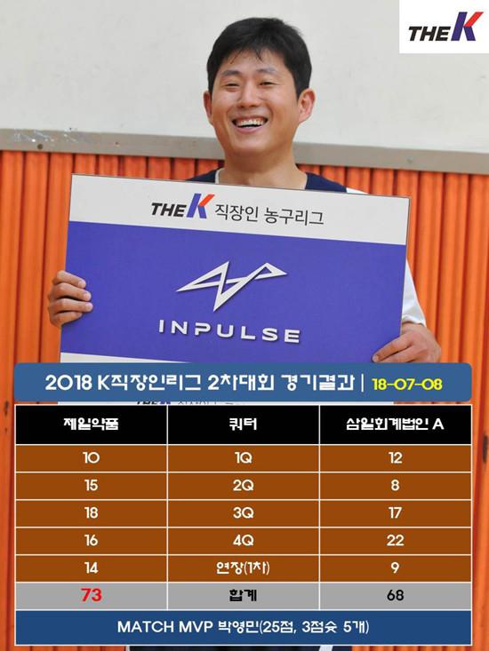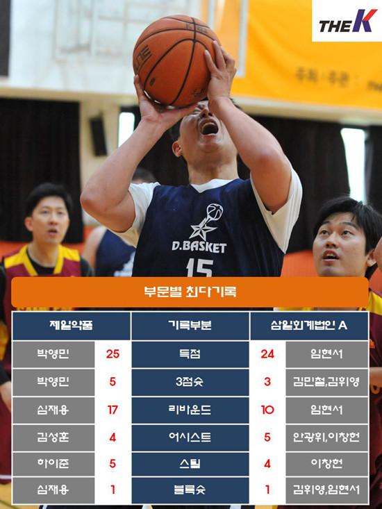 제일약품은 8일 서울 관악고등학교 체육관에서 열린 대한직장인농구협회장배 2017 The K직장인농구리그(www.kbasket.kr) 2차대회 디비전 1 A조 예선전에서 3점슛 5개 포함, 25점을 몰아친 박영민과 15점 7리바운드를 올리며 팀원들을 이끈 박정훈 활약에 힘입어 1차대회 우승팀 삼일회계법인 A를 연장접전 끝에 73-68로 꺾고 2연승을 내달렸다.