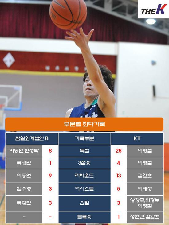 삼일회계법인 B는 이동언(8점 9리바운드), 한정탁(8점 3리바운드)을 중심으로 KT 공세에 맞섰다. 류광민도 3점슛 1개 포함, 6점 4리바운드 3스틸로 알토란같은 활약을 펼쳤다. 하지만, 전체적인 슛 난조를 극복하지 못하며 첫 승 기회를 다음으로 미뤄야 했다.