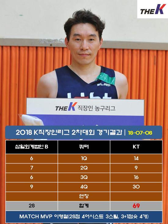 KT는 8일 서울 관악고등학교 체육관에서 열린 대한직장인농구협회장배 2018 The K직장인농구리그(www.kbasket.kr) 2차대회 디비전 2 A조 예선에서 3+1점슛 4개 포함, 28점 4어시스트 3스틸을 올린 최고참 이형철을 비롯, 출전선수 11명 전원이 득점을 올리는 고른 활약에 힘입어 삼일회계법인 B를 69-28로 꺾고 2연승을 내달렸다.