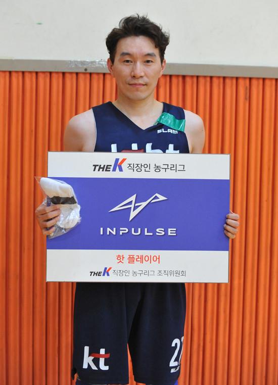 한편, 이 경기 인펄스(www.jumpmall.co.kr) 핫 플레이어에는 4쿼터에만 3+1점슛 3개 포함, 21점을 몰아치는 등 28점 4어시스트 3스틸로 맹활약한 KT 최고참 이형철이 선정되었다. 이날 The K직장인농구리그에 2번째 모습을 보인 그는 “코트에 서 있는 시간보다 벤치에 앉아있는 시간이 많았는데 오늘 경기에 딸과 아내가 같이 왔고, 동료들도 나에게 힘을 주었다. 무엇보다 가족들에게 좋은 모습 보여주고 싶었다. 오늘 경기 최우수선수로 선정된 것도 모두 가족들, 동료들 덕분이다”고 공을 돌렸다.