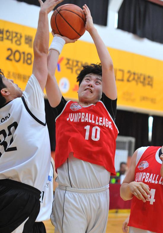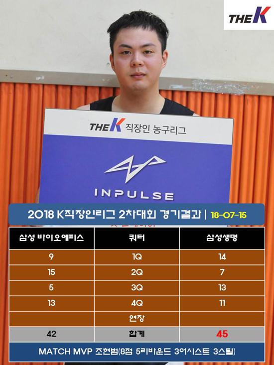 삼성생명은 15일 서울 관악고등학교 체육관에서 열린 대한직장인농구협회장배 2018 The K직장인농구리그(www.kbasket.kr) 2차대회 디비전 2 A조 예선에서 오세훈(10점 5리바운드)을 필두로 남기석(8점 4어시스트 3리바운드, 3점슛 2개), 조현범(8점 5리바운드 3어시스트 3스틸) 활약에 힘입어 삼성 바이오에피스를 접전 끝에 45-42로 꺾고 지난 KT와 경기 패배 충격을 씻어냈다.