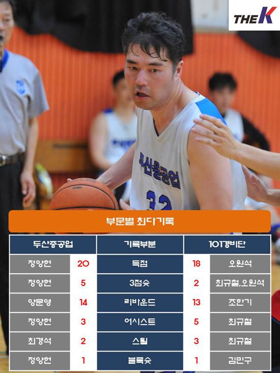 두산중공업은 이날 경기 승리로 3연승을 내달렸다. 3쿼터까지 호흡이 맞지 않은 탓에 101경비단에게 분위기를 내주기까지 했지만, 팀으로 역경을 이겨내는 모습이었다. ‘두산의 슈터’ 정양헌도 상대 집중마크에 시달리면서도 빈틈을 만들어내기 위하여 안간힘을 썼다. 이에 대해 “초반에 몸이 덜 풀린 탓에 실책이 많이 나온 탓에 1-13까지 밀렸다. 선수들 모두 마음을 추슬렀고, 한발 더 뛰자는 마음으로 경기에 임했다. 무엇보다 수비가 원하는 대로 되자 공격도 잘 풀렸다”며 “초반에 수비가 여동준 선수에게 몰렸다. 이에 나머지 선수에게 기회가 날 것이아 생각했다. 정양헌 선수가 공을 잡을 때 스크린을 많이 걸어줬고, 다른 선수들이 기회가 생기면 점수를 올릴 수 있게끔 하는 작전이 잘 통했다. 선수들 모두 부상에도 불구하고 열심히 뛰어줬다. 나도 발목이랑 허리가 좋지 않아 병원에서 뛰지 말라고 했을 정도였는데 무리해서 뛰었다. 경기 전에 테이핑을 이중으로 할 정도다. 그래도 찬스가 나면 자신 있게 던졌다. 동료들에게도 ‘못 넣어도 좋으니 찬스가 나면 자신 있게 슛을 던져라’고 말한 것이 주효했다”고 승리할 수 있었던 비결을 전했다.
