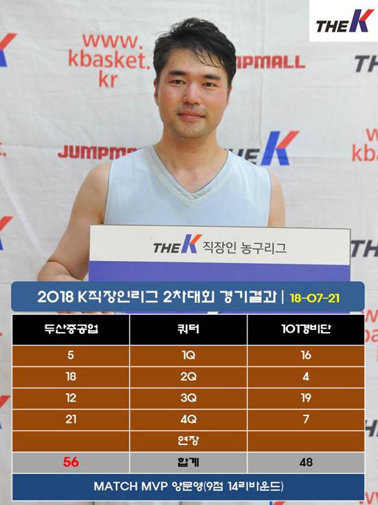 두산중공업은 21일 서울 관악고등학교 체육관에서 열린 대한직장인농구협회장배 2018 The K직장인농구리그(www.kbasket.kr) 2차대회 디비전 1 B조 예선에서 3점슛 5개 포함, 20점 3어시스트를 올린 정양헌을 필두로 여동준(18점 12리바운드), 양문영(9점 14리바운드)이 골밑을 든든하게 지켜준 덕에 101경비단을 56-48로 잡고 3연승을 내달렸다.