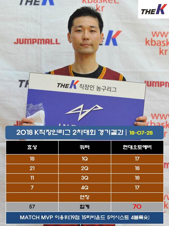 현대오토에버는 28일 서울 관악고등학교 체육관에서 열린 대한직장인농구협회장배 2018 The K직장인농구리그(www.kbasket.kr) 2차대회 디비전 1 B조 예선에서 이용휘(19점 15리바운드 5어시스트 4블록슛), 박정재(19점 3리바운드 3어시스트 3스틸, 3점슛 5개)가 38점을 합작한 데 힘입어 효성을 70-57로 꺾고 준결승 진출에 한 발짝 다가섰다.