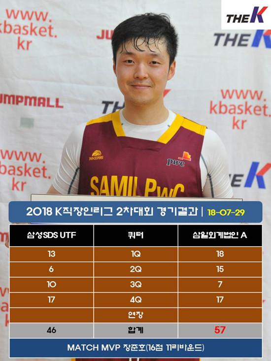 삼일회계법인 A는 29일 서울 관악고등학교 체육관에서 열린 대한직장인농구협회장배 2018 The K직장인농구리그(www.kbasket.kr) 2차대회 디비전 1 A조 예선에서 나형우(17점 6리바운드 4어시스트 3스틸), 임현서(16점 9리바운드 7스틸 5어시스트), 장준호(16점 11리바운드)가 49점을 합작한 데 힘입어 삼성SDS UTF를 57-46으로 꺾고 준결승 진출 희망을 이어나갔다.