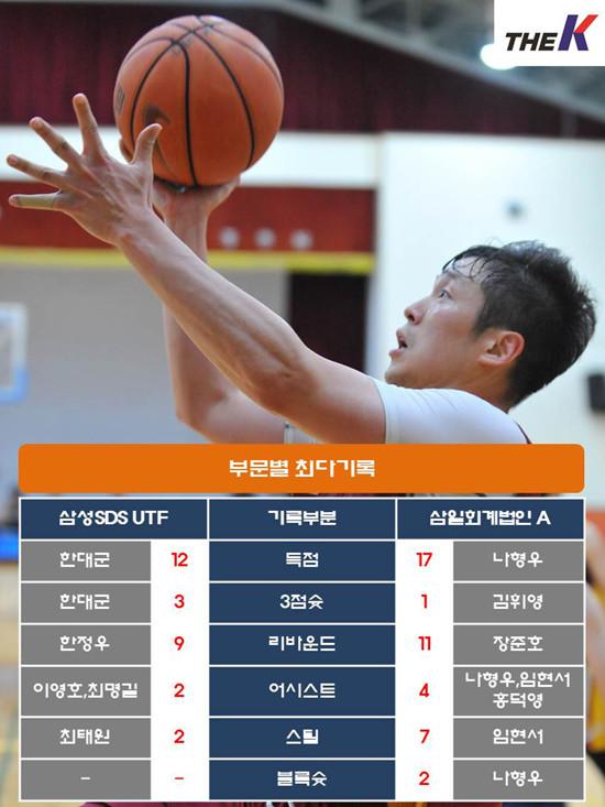 삼성SDS UTF는 한대군이 3점슛 3개 포함, 12점을 올리며 맹활약했다. 이영호(7점 6리바운드), 한정우(6점 9리바운드)는 15리바운드를 합작하며 골밑을 지켰다. 특히, 한정우는 공격리바운드만 6개를 걷어내며 한대군, 최명길, 손정훈 등 동료들에게 믿음을 주었다. 손정훈도 7점을 올리며 이들을 뒷받침했다. 하지만, 에이스 최명길이 삼일회계법인 A 임현서 수비에 고전, 6점에 그친 것이 치명타였다.