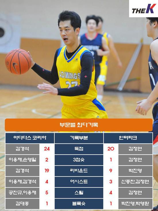 아디다스 코리아는 인터파크가 흔들리는 틈을 놓치지 않았다. 상대 실책을 곧바로 득점으로 연결하는 마무리 능력을 보여주었고, 리바운드 싸움에서도 압도적인 우위를 점했다. 김경석이 4쿼터 8점을 몰아치며 팀 공격을 이끈 가운데, 김대홍, 공진규가 골밑에서 12점을 합작했다. 이용재도 손영일, 이승호와 함께 외곽에서 김경석을 뒷받침하며 승기를 잡았다.