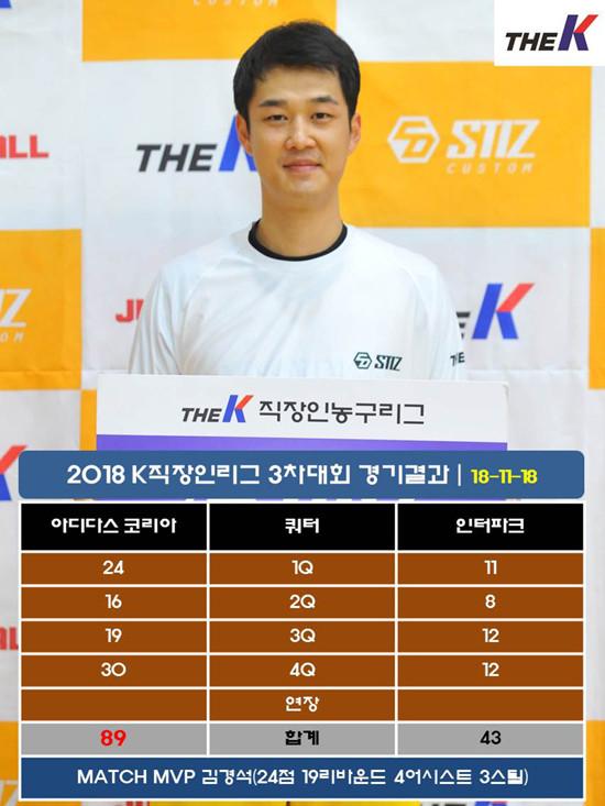 아디다스 코리아는 18일 서울 관악고등학교 체육관에서 열린 STIZ배 2018 The K직장인농구리그(www.kbasket.kr) 3차대회 디비전 2 B조 예선에서 24점 19리바운드 4어시스트 3스틸을 올린 김경석을 필두로 이용재(18점 5스틸 4리바운드 4어시스트, 3점슛 2개), 김대홍(15점 8리바운드) 등 출전선수 8명 중 5명이 두 자릿수 득점을 해내는 고른 활약에 힘입어 인터파크를 89-43으로 꺾고 준결승 진출 희망을 살려냈다.