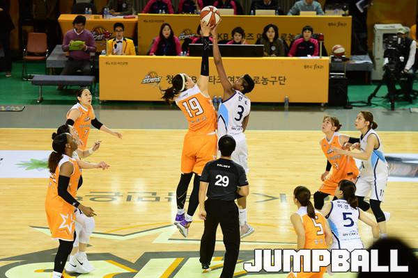 [점프볼=청주/박상혁 기자] 5일 청주실내체육관에서 우리은행 2018-2019 여자프로농구 정규리그 청주KB국민은행과 인천신한은행의 경기가 열렸다. 심판의 점프볼로 경기가 시작되었다.